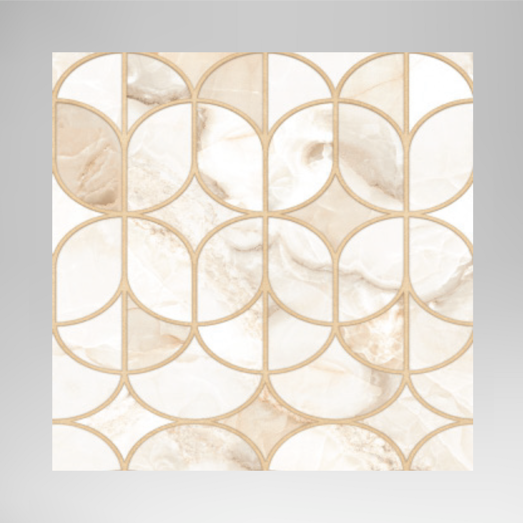 Add a statement of refined luxury to your interiors with Kajaria Eternity Onyx Beige Decor, a premium large-format glazed vitrified tile that blends the natural beauty of onyx with an elegant decorative pattern. The soft beige onyx base is enhanced with a graceful geometric arch design in warm metallic tones, creating a perfect balance of sophistication and contemporary style.