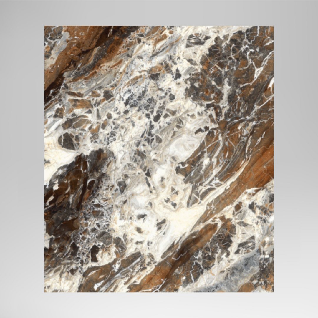 The Kajaria Lucifer Brown Ultima Glazed Vitrified Tile is a bold expression of luxury, inspired by dramatic natural stone formations. Featuring a striking fusion of deep brown, warm copper, charcoal grey, and flowing ivory veins, this tile creates a powerful visual impact. The dynamic movement of patterns across the surface makes every slab look like a work of art, perfect for high-end architectural statements.