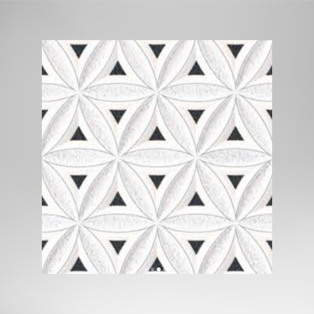 Transform any exterior or interior wall with this contemporary 300×450 mm elevation tile, designed to bring sophistication and visual depth to your space. Featuring an elegant interlocking geometric pattern of curved diamond shapes and contrasting black triangular accents, this tile creates a captivating 3D effect that instantly elevates any surface.