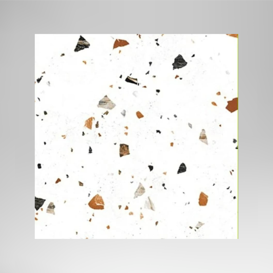 Upgrade your interiors with this elegant 600×600 mm terrazzo-finish tile, designed to bring a fresh and contemporary aesthetic to any space. The tile features a crisp white base embedded with multicolored stone-chip patterns in shades of black, grey, and terracotta, giving it a stylish and modern look. Made with durable vitrified material, it offers high strength, low water absorption, and long-lasting shine—perfect for both residential and commercial flooring.